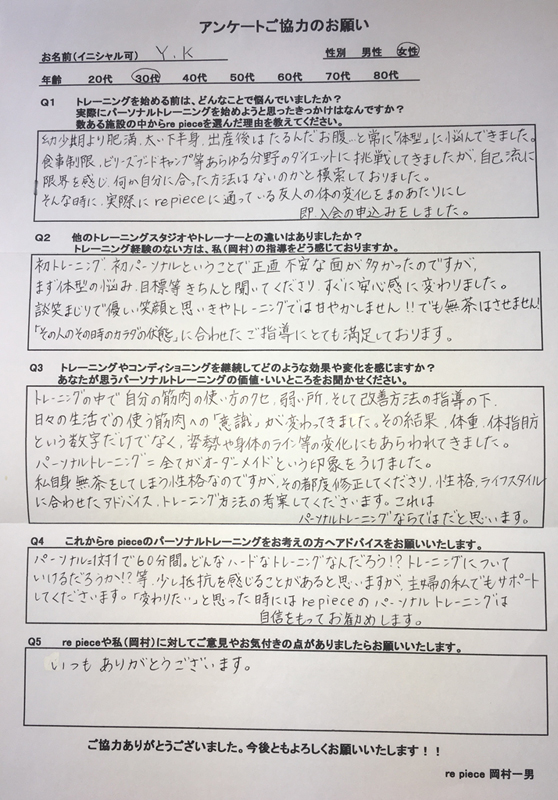 - 運動が嫌いだったり苦手な方、続かない方、痩せたい方、リバウンドしてしまう方、リフレッシュしたい方、腰痛でお悩みの方、私は上記のすべてに当てはまります。 難点の多い身体と精神(自分に甘い)の私を上手く引っ張って下さり楽しく続けていけるのはre pieceしかありません。岡村さんはお人柄も良いし、プロ意識が高く、知識も豊富なのであなたの体の無理難題を投げかけてみてください(笑) 必ず楽しく答えを見つけだしてあなたの理想へ連れていってくれますよ!